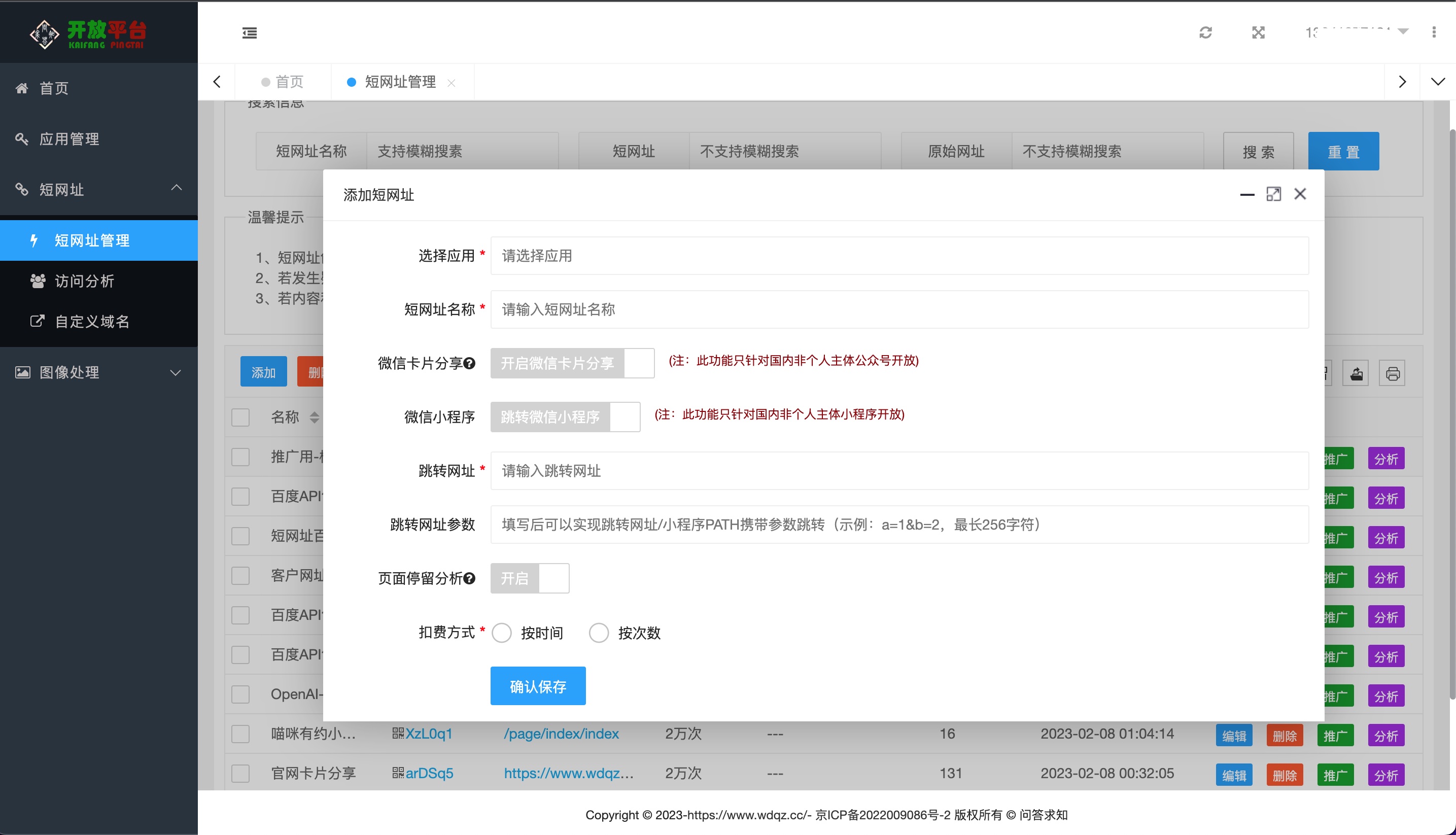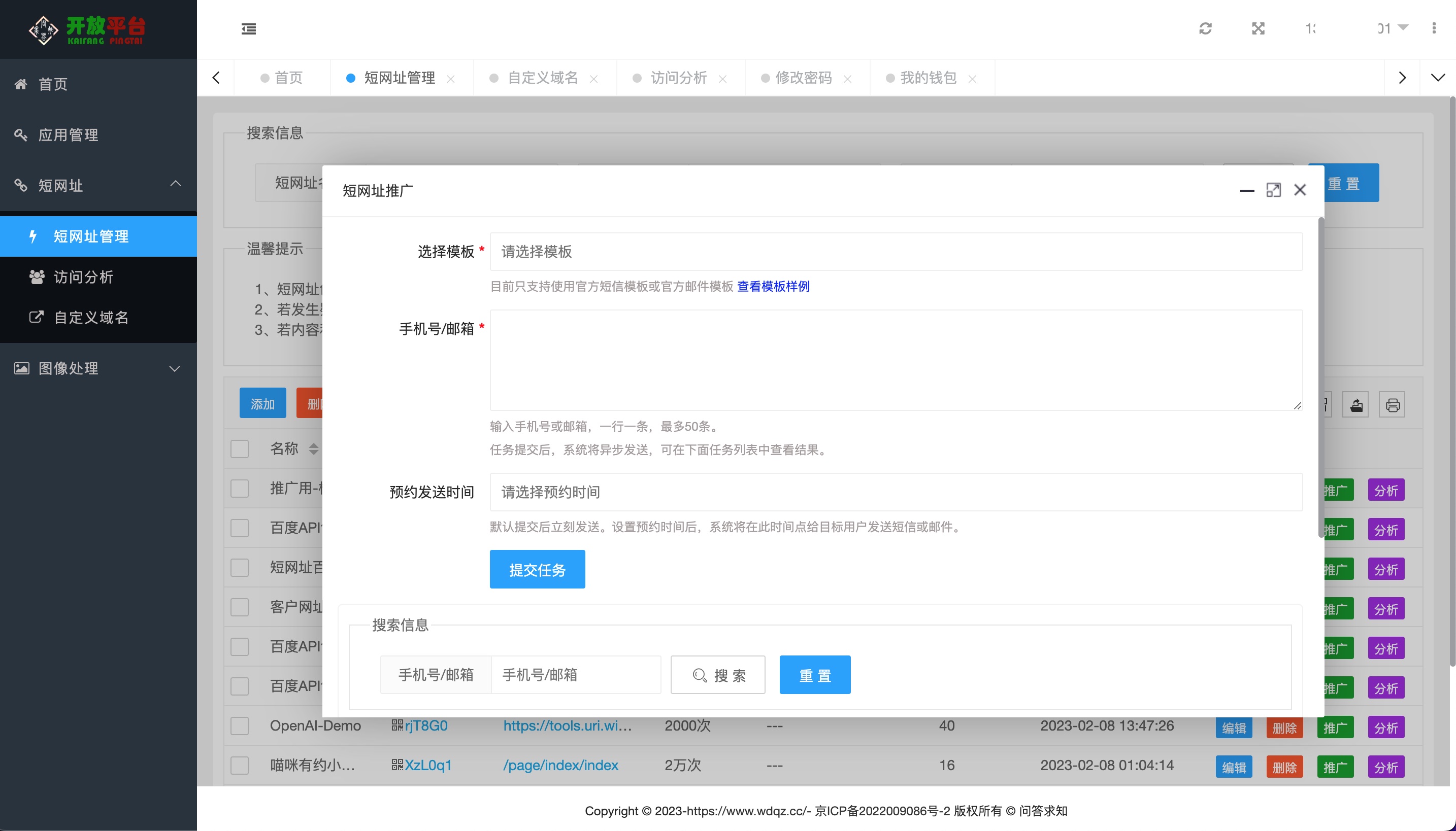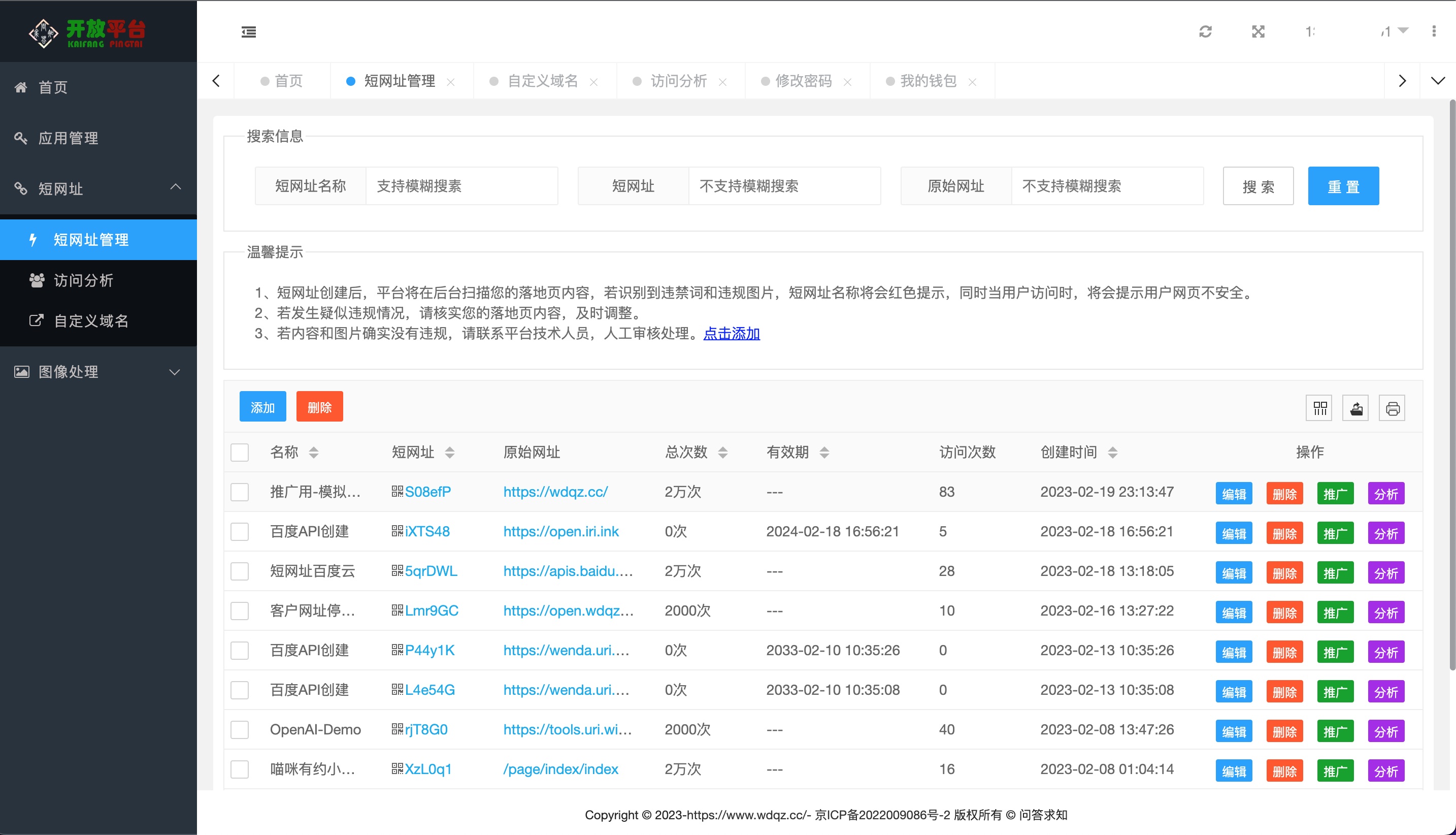 (二)短网址功能,平台支持在线短网址创建、编辑、查询。